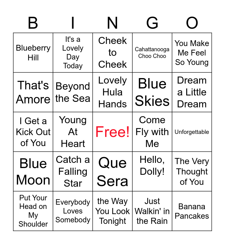 This bingo card has a free space and 24 words: Put Your Head on My Shoulder, Catch a Falling Star, Lovely Hula Hands, Just Walkin' in the Rain, You Make Me Feel So Young, Blueberry Hill, It's a Lovely Day Today, Cheek to Cheek, Come Fly with Me, Unforgettable, I Get a Kick Out of You, Beyond the Sea, Hello, Dolly!, The Very Thought of You, That's Amore, Everybody Loves Somebody, the Way You Look Tonight, Cahattanooga Choo Choo, Dream a Little Dream, Blue Moon, Young At Heart, Que Sera, Blue Skies and Banana Pancakes.