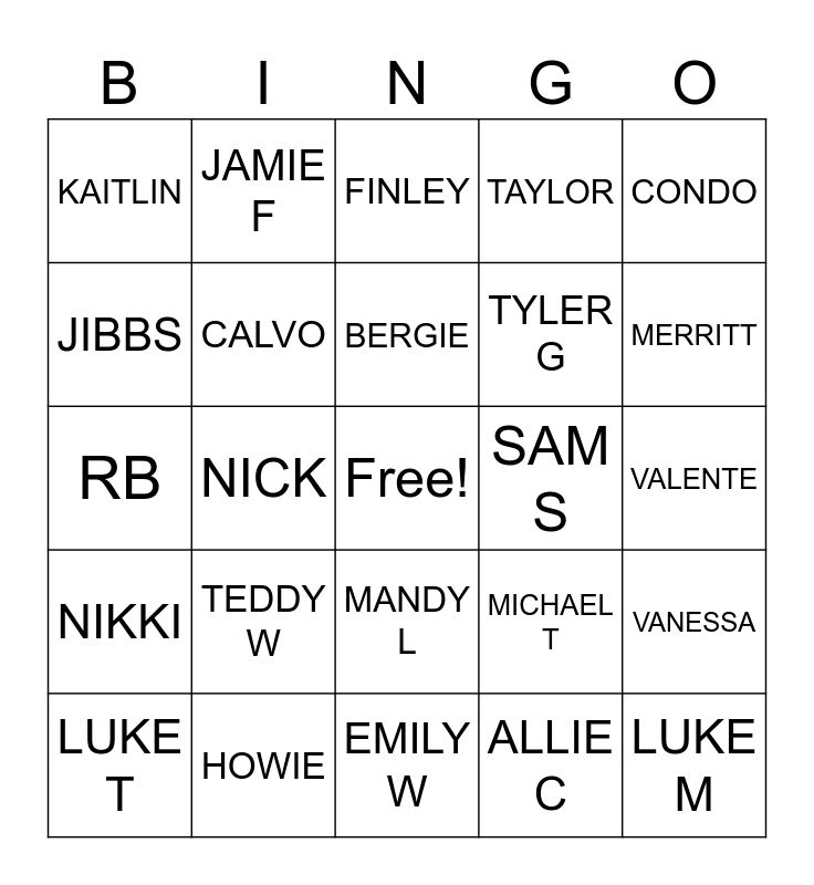 This bingo card has a free space and 46 words: EROY, LUKE M, MATT H, EMILY W, TEDDY W, TIM M, JAMIE F, JULIA S, JIBBS, LACAMERA, CALVO, TAYLOR, VANESSA, MICHAEL T, MAREN, JENNY, BERGIE, SAM S, DAWSON, CONDO, NICK, ALLIE C, KAITLIN, TYLER G, MARSHALL, MERRITT, LUKE T, BRANDON K, MANDY L, NIKKI, JANELLY, TOMMY M, RUSS, TEMPLETON, MICHAEL R, HOWIE, VALENTE, FISCH, SCOTT, LIAM, ROONEY, FINLEY, RB, WILL VARSANO, LEV and BELLA.