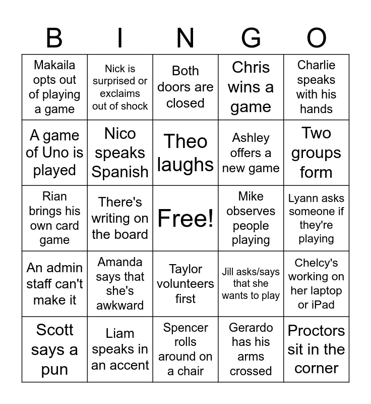 This bingo card has a free space and 24 words: Amanda says that she's awkward, Liam speaks in an accent, Theo laughs, Scott says a pun, Charlie speaks with his hands, Makaila opts out of playing a game, A game of Uno is played, Nick is surprised or exclaims out of shock, Mike observes people playing, Taylor volunteers first, Ashley offers a new game, Rian brings his own card game, Jill asks/says that she wants to play, Chelcy's working on her laptop or iPad, Nico speaks Spanish, Gerardo has his arms crossed, Lyann asks someone if they're playing, Both doors are closed, Two groups form, There's writing on the board, Proctors sit in the corner, An admin staff can't make it, Chris wins a game and Spencer rolls around on a chair.