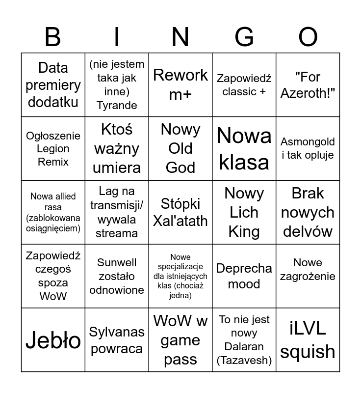 This bingo card has a free space and 24 words: Sunwell zostało odnowione, Sylvanas powraca, Nowy Old God, Jebło, "For Azeroth!", Data premiery dodatku, Ogłoszenie Legion Remix, (nie jestem taka jak inne) Tyrande, Nowy Lich King, Nowe specjalizacje dla istniejących klas (chociaż jedna), Nowa klasa, Nowa allied rasa (zablokowana osiągnięciem), Deprecha mood, Nowe zagrożenie, Ktoś ważny umiera, To nie jest nowy Dalaran (Tazavesh), Brak nowych delvów, Rework m+, Asmongold i tak opluje, Lag na transmisji/ wywala streama, iLVL squish, Zapowiedź czegoś spoza WoW, Zapowiedź classic + and WoW w game pass.