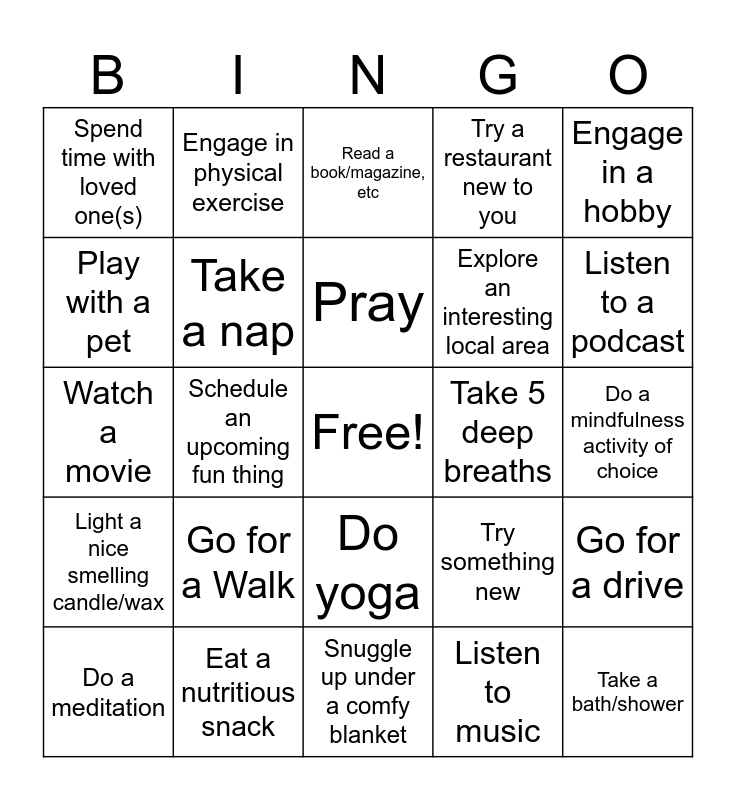 This bingo card has a free space and 24 words: Go for a Walk, Eat a nutritious snack, Pray, Do a meditation, Engage in a hobby, Spend time with loved one(s), Play with a pet, Engage in physical exercise, Take 5 deep breaths, Do yoga, Explore an interesting local area, Watch a movie, Try something new, Go for a drive, Take a nap, Listen to music, Do a mindfulness activity of choice, Read a book/magazine, etc, Listen to a podcast, Schedule an upcoming fun thing, Take a bath/shower, Light a nice smelling candle/wax, Try a restaurant new to you and Snuggle up under a comfy blanket.
