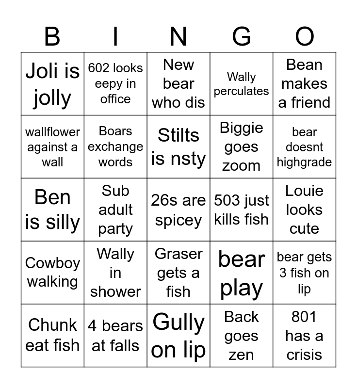 This bingo card has 25 words: Wally in shower, Gully on lip, Stilts is nsty, Chunk eat fish, Bean makes a friend, Joli is jolly, wallflower against a wall, 602 looks eepy in office, 503 just kills fish, Graser gets a fish, Biggie goes zoom, Ben is silly, bear play, bear gets 3 fish on lip, Boars exchange words, 801 has a crisis, Louie looks cute, New bear who dis, bear doesnt highgrade, Sub adult party, 26s are spicey, 4 bears at falls, Cowboy walking, Wally perculates and Back goes zen.