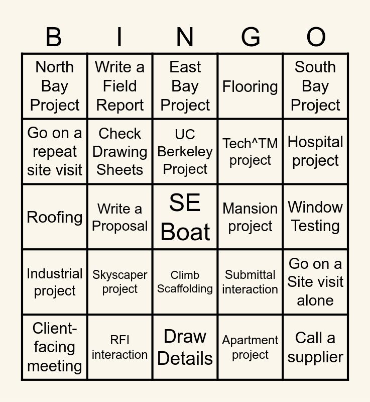 This bingo card has a free space and 24 words: Skyscaper project, RFI interaction, UC Berkeley Project, Client-facing meeting, South Bay Project, North Bay Project, Go on a repeat site visit, Write a Field Report, Mansion project, Climb Scaffolding, Tech^TM project, Roofing, Submittal interaction, Go on a Site visit alone, Check Drawing Sheets, Apartment project, Window Testing, East Bay Project, Hospital project, Write a Proposal, Call a supplier, Industrial project, Flooring and Draw Details.