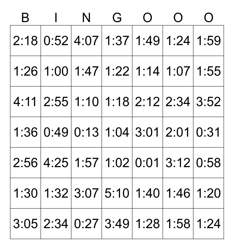 This bingo card has 49 words: 1:46, 1:07, 1:28, 0:49, 1:10, 0:31, 0:52, 0:27, 1:24, 1:02, 1:59, 1:37, 2:34, 2:12, 1:32, 2:01, 1:26, 1:55, 1:20, 1:49, 1:14, 0:13, 2:18, 1:00, 3:05, 1:47, 3:52, 2:34, 1:18, 2:55, 1:24, 3:01, 1:30, 3:07, 1:36, 0:01, 3:12, 0:58, 4:11, 1:57, 5:10, 2:56, 1:04, 3:49, 1:22, 4:07, 1:40, 4:25 and 1:58.