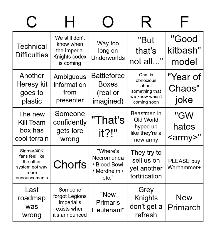 This bingo card has a free space and 24 words: Chorfs, Someone forgot Legions Imperialis exists when it's announced, Battleforce Boxes (real or imagined), Last roadmap was wrong, "Good kitbash" model, Technical Difficulties, Another Heresy kit goes to plastic, We still don't know when the Imperial Knights codex is coming, Beastmen in Old World hyped up like they're a new army, "Where's Necromunda / Blood Bowl / Mordheim / etc.", Chat is obnoxious about something that we know wasn't coming soon, The new Kill Team box has cool terrain, They try to sell us on yet another fortification, PLEASE buy Warhammer+, Ambiguous information from presenter, Grey Knights don't get a refresh, "GW hates <army>", Way too long on Underworlds, "Year of Chaos" joke, Someone confidently gets lore wrong, New Primarch, Sigmar/40K fans feel like the other system got way more announcements, "But that's not all..." and "New Primaris Lieutenant".