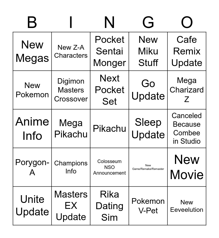 This bingo card has a free space and 24 words: Champions Info, Masters EX Update, Next Pocket Set, Unite Update, Cafe Remix Update, New Megas, New Pokemon, New Z-A Characters, Sleep Update, Colosseum NSO Announcement, Go Update, Anime Info, New Game/Remake/Remaster, New Movie, Digimon Masters Crossover, Pokemon V-Pet, Canceled Because Combee in Studio, Pocket Sentai Monger, Mega Charizard Z, Mega Pikachu, New Eeveelution, Porygon-A, New Miku Stuff and Rika Dating Sim.