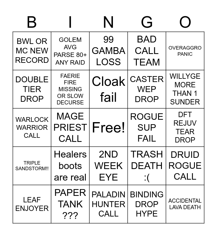 This bingo card has a free space and 24 words: Healers boots are real, PAPER TANK ???, Cloak fail, LEAF ENJOYER, OVERAGGRO PANIC, BWL OR MC NEW RECORD, DOUBLE TIER DROP, GOLEM AVG PARSE 80+ ANY RAID, ROGUE SUP FAIL, 2ND WEEK EYE, CASTER WEP DROP, WARLOCK WARRIOR CALL, TRASH DEATH :(, DRUID ROGUE CALL, FAERIE FIRE MISSING OR SLOW DECURSE, BINDING DROP HYPE, DFT REJUV TEAR DROP, 99 GAMBA LOSS, WILLYGE MORE THAN 1 SUNDER, MAGE PRIEST CALL, ACCIDENTAL LAVA DEATH, TRIPLE SANDSTORM!!, BAD CALL TEAM and PALADIN HUNTER CALL.