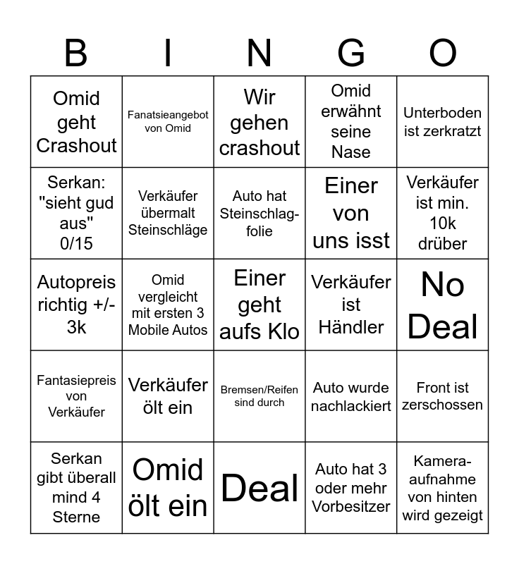 This bingo card has 25 words: Fantasiepreis von Verkäufer, Omid ölt ein, Einer geht aufs Klo, Auto hat 3 oder mehr Vorbesitzer, Unterboden ist zerkratzt, Omid geht Crashout, Fanatsieangebot von Omid, Wir gehen crashout, Verkäufer ist Händler, Front ist zerschossen, Serkan: ''sieht gud aus'' 0/15, Verkäufer übermalt Steinschläge, Deal, Auto wurde nachlackiert, Verkäufer ist min. 10k drüber, Serkan gibt überall mind 4 Sterne, Omid vergleicht mit ersten 3 Mobile Autos, Auto hat Steinschlag- folie, Einer von uns isst, No Deal, Autopreis richtig +/- 3k, Verkäufer ölt ein, Bremsen/Reifen sind durch, Omid erwähnt seine Nase and Kamera- aufnahme von hinten wird gezeigt.