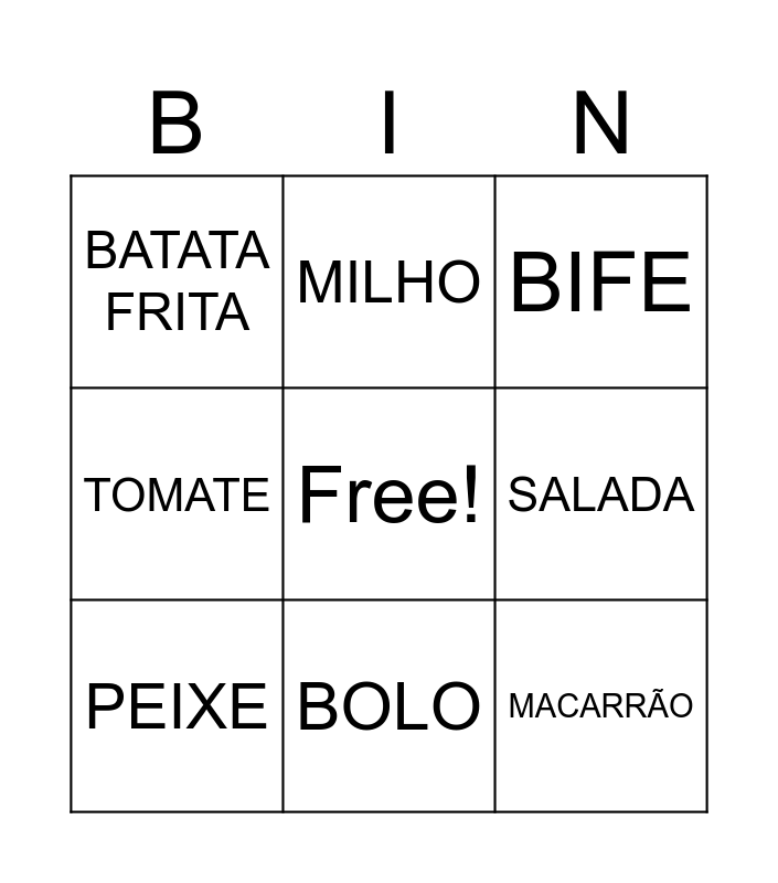 This bingo card has a free space and 14 words: FAROFA, CUSCUZ, PEIXE, MILHO, TOMATE, MACARRÃO, ARROZ, FEIJÃO, BOLO, BATATA FRITA, SORVETE, SALADA, BIFE and PÃO.