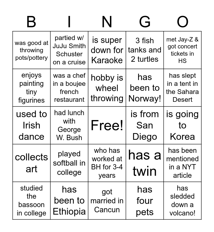 This bingo card has a free space and 55 words: cheered in college, studied the bassoon in college, loves oreos!!, was good at throwing pots/pottery, got married in Cancun, lived in Hawaii or Thailand, was a chef in a boujee french restaurant, has never broken a bone, has been to Norway!, met Shia LaBeouf, 3 fish tanks and 2 turtles, can make Dolphin noises, used to box competitively!, has shaken hands with the King of Morocco, has a tiktok famous childhood bestie, is passionate about Interior Design, met Jay-Z & got concert tickets in HS, had lunch with George W. Bush, enjoys genealogy research, has sledded down a volcano!, is from San Diego, loves Disney!, has a twin, is super down for Karaoke, met the Chainsmokers in the Toronto airport, hobby is wheel throwing, has four pets, loves doing DIY!, is going to Korea, has been mentioned in a NYT article, just went to Hawaii, is a horse girl, is the first in their family to get a BA/BS, went to the past Superbowl in NOLA!, enjoys painting tiny figurines, used to Irish dance, worked at Hollister in the mall, collects art, danced like MJ for HS talent show, wants to go on survivor and win, partied w/ JuJu Smith Schuster on a cruise, sat next to Lindsay Vonn at a basketball game, has a 16yo Westie named Otis, has been to 40+ states, played softball in college, has been to Ethiopia, went to Africa for 3 weeks, can play the Ukulele, was born on Saipan, has slept in a tent in the Sahara Desert, has 2 rescue dogs, loves the Eagles, who has worked at BH for 2 years, who has worked at BH for 3-4 years and who has worked at BH for 5-8 years.