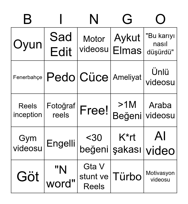 This bingo card has a free space and 24 words: Engelli, "N word", Cüce, Göt, "Bu karıyı nasıl düşürdü", Oyun, Fenerbahçe, Sad Edit, >1M Beğeni, <30 beğeni, Ameliyat, Reels inception, K*rt şakası, AI video, Pedo, Türbo, Araba videosu, Motor videosu, Ünlü videosu, Fotoğraf reels, Motivasyon videosu, Gym videosu, Aykut Elmas and Gta V stunt ve Reels.