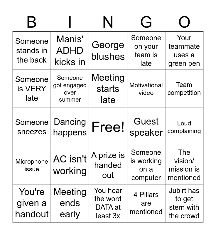 This bingo card has a free space and 24 words: AC isn't working, Meeting ends early, Meeting starts late, You're given a handout, Your teammate uses a green pen, Someone stands in the back, Someone is VERY late, Manis' ADHD kicks in, Guest speaker, A prize is handed out, Motivational video, Someone sneezes, Someone is working on a computer, The vision/ mission is mentioned, Someone got engaged over summer, 4 Pillars are mentioned, Loud complaining, George blushes, Team competition, Dancing happens, Jubirt has to get stern with the crowd, Microphone issue, Someone on your team is late and You hear the word DATA at least 3x.