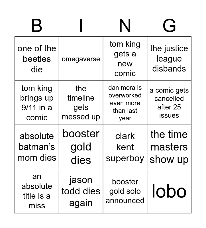 This bingo card has 16 words: jason todd dies again, the time masters show up, tom king gets a new comic, one of the beetles die, absolute batman’s mom dies, omegaverse, clark kent superboy, booster gold solo announced, tom king brings up 9/11 in a comic, the timeline gets messed up, an absolute title is a miss, the justice league disbands, booster gold dies, a comic gets cancelled after 25 issues, dan mora is overworked even more than last year and lobo.