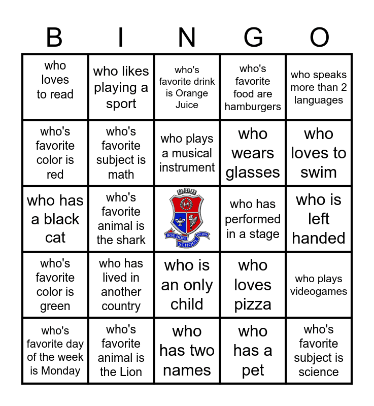 This bingo card has a free space and 24 words: who has lived in another country, who's favorite animal is the Lion, who plays a musical instrument, who's favorite day of the week is Monday, who speaks more than 2 languages, who loves to read, who's favorite color is red, who likes playing a sport, who has performed in a stage, who is an only child, who wears glasses, who has a black cat, who loves pizza, who plays videogames, who's favorite subject is math, who has a pet, who is left handed, who's favorite drink is Orange Juice, who loves to swim, who's favorite animal is the shark, who's favorite subject is science, who's favorite color is green, who's favorite food are hamburgers and who has two names.