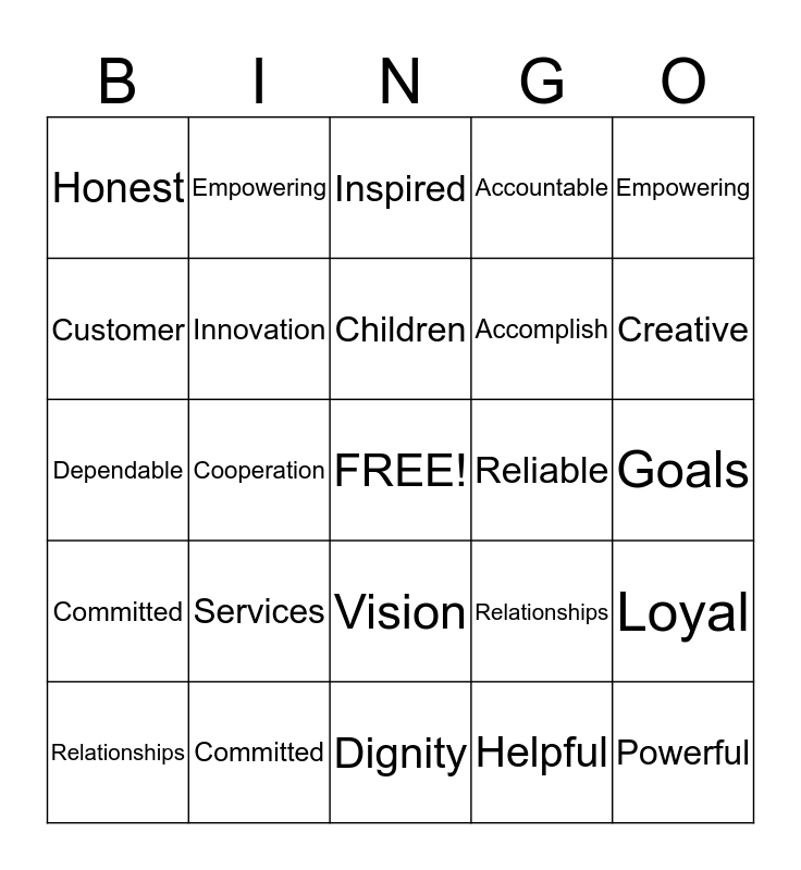 This bingo card has a free space and 37 words: Teamwork, Communication, Accomplish, Innovation, Loyal, Services, Children, Dependable, Empowering, Trust, Cooperation, Accountable, Powerful, Goals, Customer, Committed, Respect, Inspired, Vision, Reliable, Honest, Creative, Relationships, Dignity, Families, Helpful, Empowering, Loyal, Dedicated, Inspired, Consistent, Committed, Dependable, Accountable, Relationships, Accomplish and Reliable.