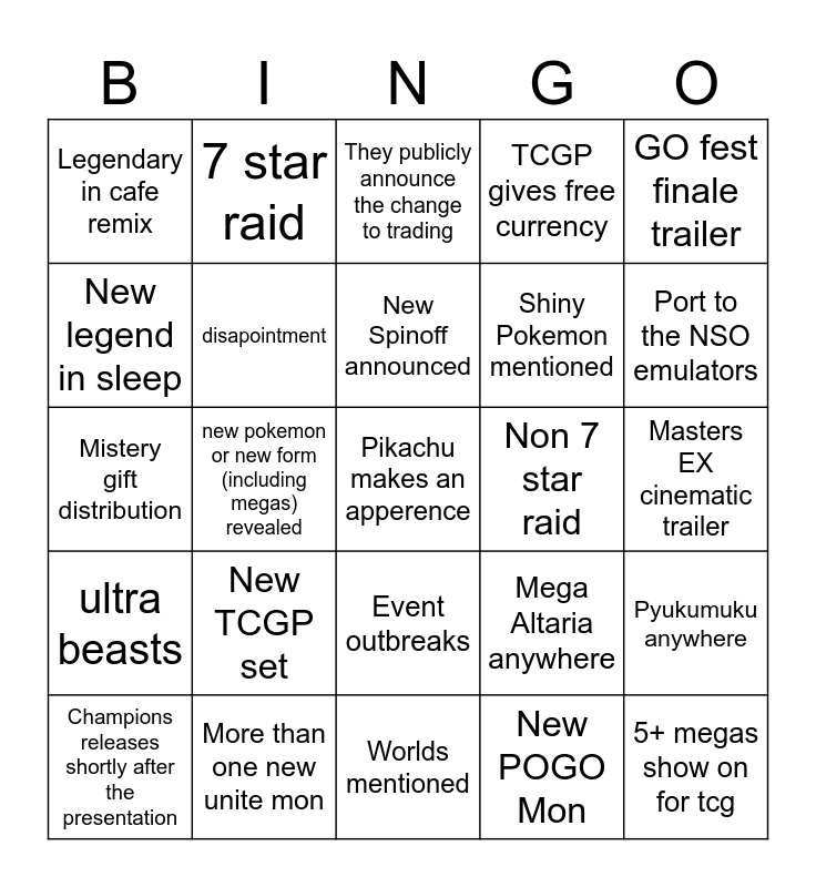 This bingo card has a free space and 24 words: New TCGP set, More than one new unite mon, New Spinoff announced, Champions releases shortly after the presentation, GO fest finale trailer, Legendary in cafe remix, New legend in sleep, 7 star raid, Non 7 star raid, Event outbreaks, Shiny Pokemon mentioned, Mistery gift distribution, Mega Altaria anywhere, Pyukumuku anywhere, disapointment, New POGO Mon, Masters EX cinematic trailer, They publicly announce the change to trading, Port to the NSO emulators, new pokemon or new form (including megas) revealed, 5+ megas show on for tcg, ultra beasts, TCGP gives free currency and Worlds mentioned.