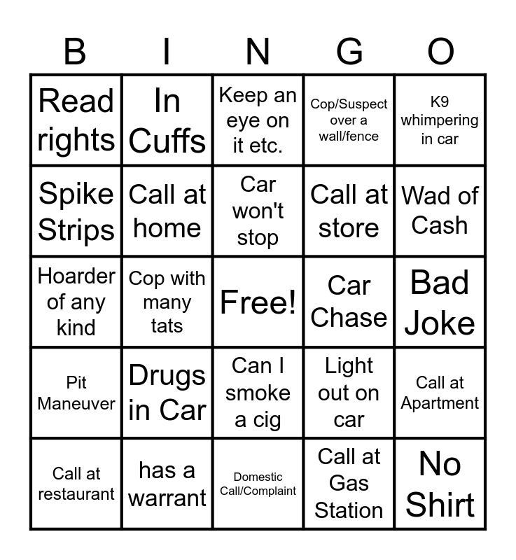 This bingo card has a free space and 46 words: Noise Complaint, No Shirt, Gun Found, Domestic Call/Complaint, Drugs in Car, Drugs on person, In Cuffs, No ID, Spike Strips, Smell Pot, Call at home, Cop/Suspect over a wall/fence, Call at Apartment, Light out on car, Ambulance, Fire Truck, Car won't stop, Car Chase, Foot Pursuit, K9 whimpering in car, Cop with many tats, Call at Gas Station, Read rights, Call at store, Blood, Wad of Cash, Call at restaurant, DUI, Can I smoke a cig, Pit Maneuver, Am I on TV? Why filming?, No Shoes, Call at a bar, Bro/Bud/Dude/Man, Serving a warrant, has a warrant, Bad Joke, Car Crash, Drunk or Impaired, Alarm at home/business, Repeated bleeped words, Keep an eye on it etc., Hoarder of any kind, I didn't do it/Not mine, K9 used and Multiple teeth missing.