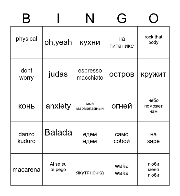 This bingo card has a free space and 24 words: Balada, Ai se eu te pego, espresso macchiato, macarena, rock that body, physical, dont worry, oh,yeah, огней, едем едем, остров, конь, само собой, на заре, judas, waka waka, небо поможет нам, кухни, кружит, anxiety, люби меня люби, danzo kuduro, на титанике and якутяночка.