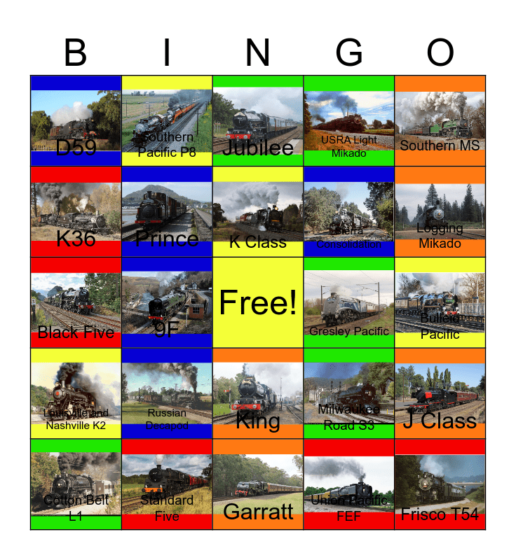 This bingo card has 24 images, a free space and 24 words: Russian Decapod, Standard Five, K Class, Cotton Belt L1, Southern MS, D59, K36, Southern Pacific P8, Gresley Pacific, King, Sierra Consolidation, Black Five, Milwaukee Road S3, J Class, Prince, Union Pacific FEF, Bulleid Pacific, Jubilee, Logging Mikado, 9F, Frisco T54, Louisville and Nashville K2, USRA Light Mikado and Garratt.