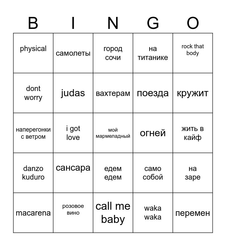 This bingo card has a free space and 24 words: сансара, розовое вино, вахтерам, macarena, rock that body, physical, dont worry, самолеты, огней, едем едем, поезда, наперегонки с ветром, само собой, на заре, judas, waka waka, жить в кайф, город сочи, кружит, i got love, перемен, danzo kuduro, на титанике and call me baby.
