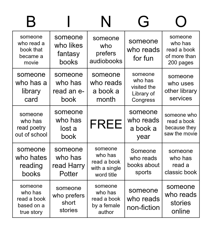 This bingo card has a free space and 24 words: someone who has read Harry Potter, someone who prefers short stories, someone who reads a book a month, someone who has read a book based on a true story, someone who has read a book of more than 200 pages, someone who read a book that became a movie, someone who has a library card, someone who likes fantasy books, someone who reads a book a year, someone who has read a book with a single word title, someone who has visited the Library of Congress, someone who has read poetry out of school, Someone who reads books about sports, someone who has read a classic book, someone who has read an e-book, someone who reads non-fiction, someone who read a book because they saw the movie, someone who prefers audiobooks, someone who uses other library services, someone who has lost a book, someone who reads stories online, someone who hates reading books, someone who reads for fun and someone who has read a book by a female author.