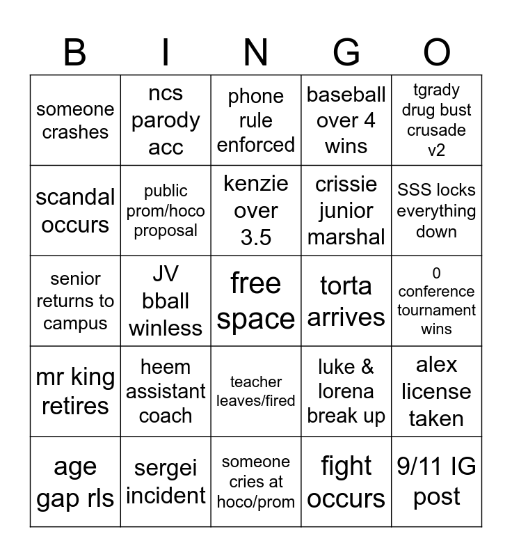 This bingo card has a free space and 24 words: age gap rls, heem assistant coach, kenzie over 3.5, fight occurs, tgrady drug bust crusade v2, someone crashes, ncs parody acc, phone rule enforced, torta arrives, 0 conference tournament wins, senior returns to campus, public prom/hoco proposal, luke & lorena break up, alex license taken, scandal occurs, sergei incident, someone cries at hoco/prom, baseball over 4 wins, SSS locks everything down, mr king retires, JV bball winless, teacher leaves/fired, crissie junior marshal and 9/11 IG post.