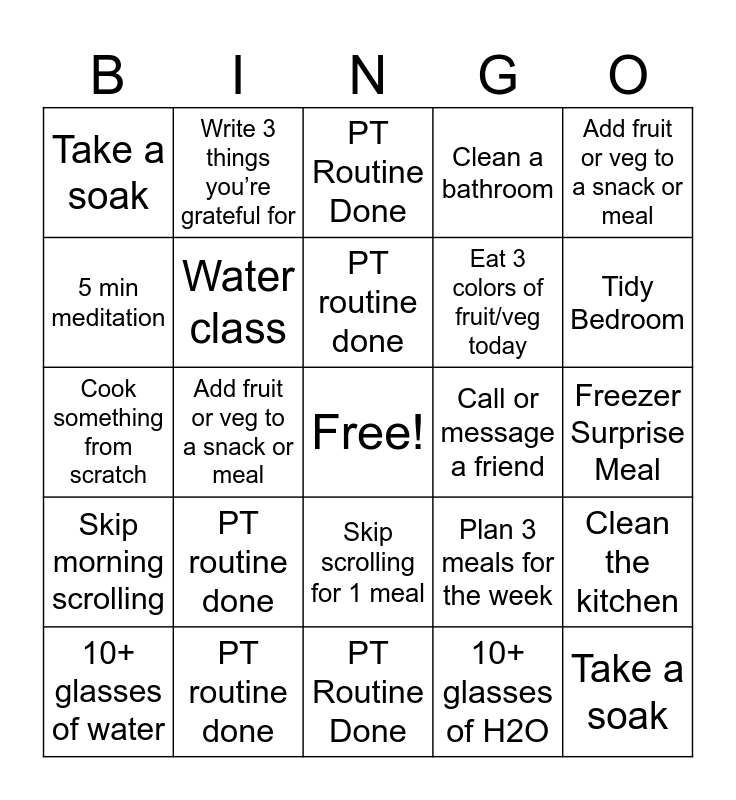 This bingo card has a free space and 24 words: PT routine done, PT routine done, PT routine done, 10+ glasses of water, Add fruit or veg to a snack or meal, Take a soak, 5 min meditation, Write 3 things you’re grateful for, Call or message a friend, Skip scrolling for 1 meal, Eat 3 colors of fruit/veg today, Cook something from scratch, Plan 3 meals for the week, Clean the kitchen, Water class, 10+ glasses of H2O, Freezer Surprise Meal, PT Routine Done, Tidy Bedroom, Add fruit or veg to a snack or meal, Take a soak, Skip morning scrolling, Clean a bathroom and PT Routine Done.