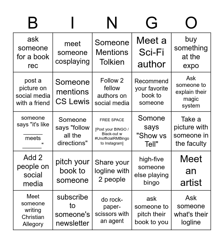 This bingo card has a free space and 29 words: Meet someone writing Christian Allegory, Meet a fantasy author, Someone says "follow all the directions", exchange business cards with 3 people, ask someone for a book rec, Someone Mentions Tolkien, Someone mentions CS Lewis, pitch your book to someone, Somone says "Show vs Tell", subscribe to someone's newsletter, Take a picture with someone in the faculty, Ask someone what's their logline, do rock-paper-scissors with an agent, ask someone to pitch their book to you, Ask someone to explain their magic system, Ask a staff member their biggest reading pet peeve, Share your logline with 2 people, Add 2 people on social media, buy something at the expo, someone says "it's like ______ meets ______", high-five someone else playing bingo, do a thumb war with an editor, Recommend your favorite book to someone, post a picture on social media with a friend, Meet a Sci-Fi author, meet someone cosplaying, Meet an artist, Follow 2 fellow authors on social media and Someone mentions prepositions.