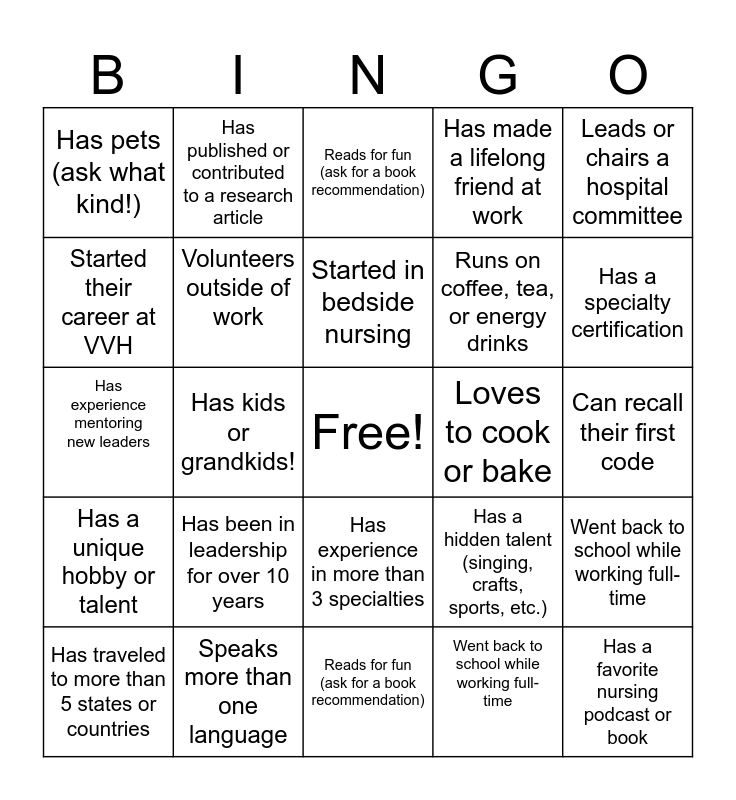 This bingo card has a free space and 24 words: Has been in leadership for over 10 years, Speaks more than one language, Started in bedside nursing, Has traveled to more than 5 states or countries, Leads or chairs a hospital committee, Has pets (ask what kind!), Started their career at VVH, Has published or contributed to a research article, Loves to cook or bake, Has experience in more than 3 specialties, Runs on coffee, tea, or energy drinks, Has experience mentoring new leaders, Has a hidden talent (singing, crafts, sports, etc.), Went back to school while working full-time, Volunteers outside of work, Went back to school while working full-time, Can recall their first code, Reads for fun (ask for a book recommendation), Has a specialty certification, Has kids or grandkids!, Has a favorite nursing podcast or book, Has a unique hobby or talent, Has made a lifelong friend at work and Reads for fun (ask for a book recommendation).