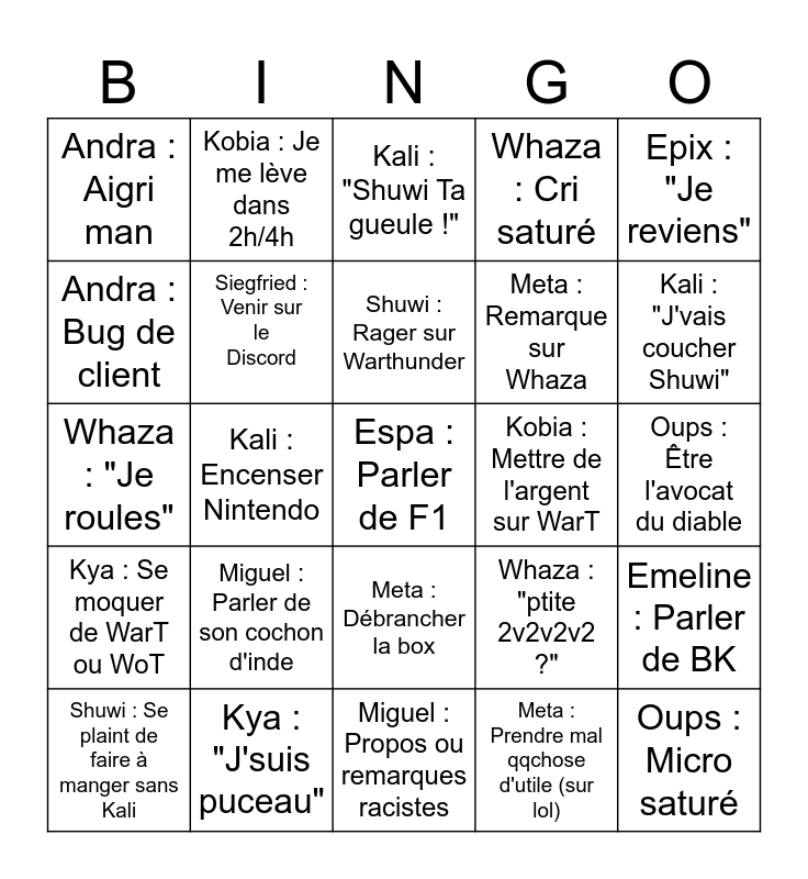 This bingo card has 25 words: Miguel : Parler de son cochon d'inde, Miguel : Propos ou remarques racistes, Shuwi : Rager sur Warthunder, Shuwi : Se plaint de faire à manger sans Kali, Epix : "Je reviens", Andra : Aigri man, Andra : Bug de client, Kobia : Je me lève dans 2h/4h, Kobia : Mettre de l'argent sur WarT, Meta : Débrancher la box, Meta : Remarque sur Whaza, Whaza : "Je roules", Whaza : "ptite 2v2v2v2 ?", Emeline : Parler de BK, Siegfried : Venir sur le Discord, Oups : Micro saturé, Oups : Être l'avocat du diable, Kali : "Shuwi Ta gueule !", Kali : "J'vais coucher Shuwi", Kali : Encenser Nintendo, Espa : Parler de F1, Kya : "J'suis puceau", Kya : Se moquer de WarT ou WoT, Whaza : Cri saturé and Meta : Prendre mal qqchose d'utile (sur lol).