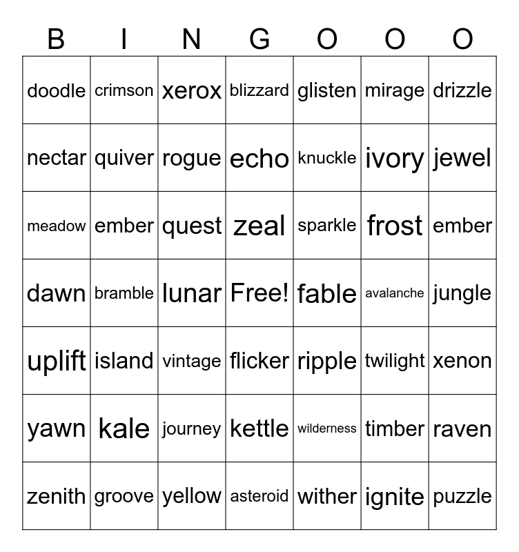 This bingo card has a free space and 76 words: zebra, yawn, xerox, wilderness, vortex, umbrella, twilight, symphony, ripple, quartz, puzzle, oxide, nectar, mirage, lumber, knuckle, jungle, ivory, harmony, glisten, flicker, echo, drizzle, crimson, blizzard, asteroid, zenith, yellow, xylophone, wander, vintage, unicorn, tundra, sparkle, rogue, quiver, python, nostalgia, meadow, lunar, kettle, journey, ignite, harvest, glimmer, fable, ember, doodle, cascade, breeze, avalanche, zeal, yonder, xenon, wither, vow, uplift, timber, solace, raven, quest, pinnacle, nuzzle, myth, lilac, kale, jewel, island, horizon, groove, frost, ember, dawn, cloud, bramble and arcade.