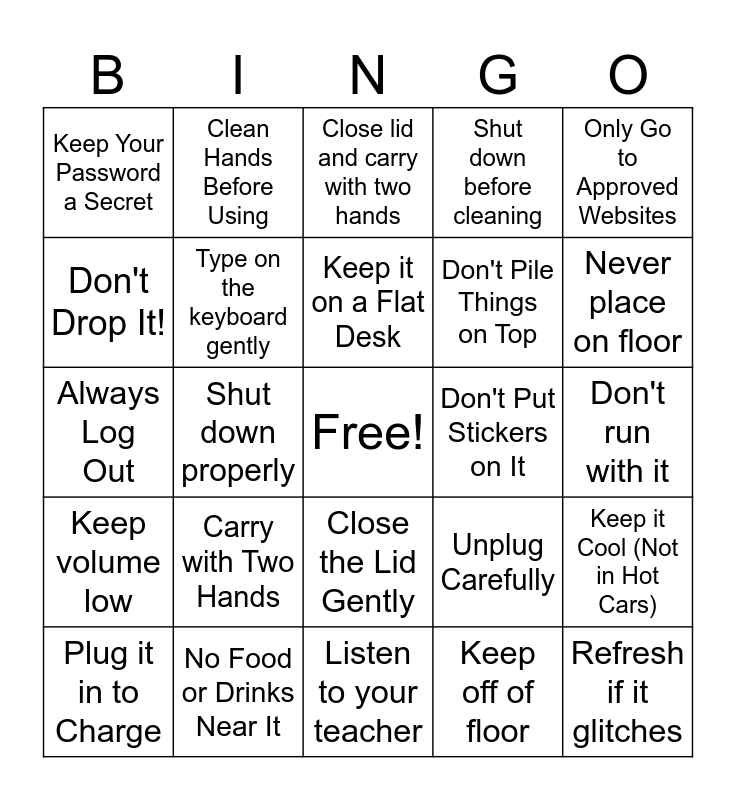 This bingo card has a free space and 24 words: Carry with Two Hands, No Food or Drinks Near It, Keep it on a Flat Desk, Plug it in to Charge, Only Go to Approved Websites, Keep Your Password a Secret, Don't Drop It!, Clean Hands Before Using, Don't Put Stickers on It, Close the Lid Gently, Don't Pile Things on Top, Always Log Out, Unplug Carefully, Keep it Cool (Not in Hot Cars), Type on the keyboard gently, Keep off of floor, Don't run with it, Close lid and carry with two hands, Never place on floor, Shut down properly, Refresh if it glitches, Keep volume low, Shut down before cleaning and Listen to your teacher.