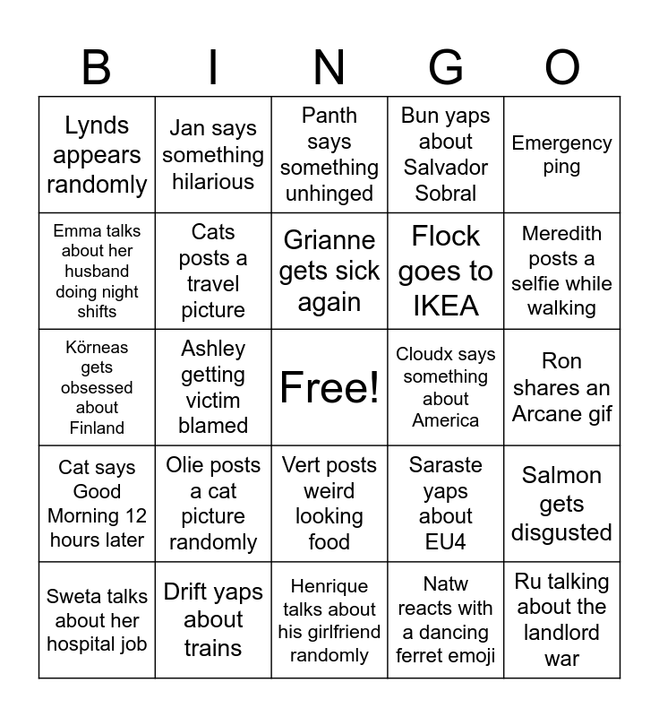 This bingo card has a free space and 24 words: Olie posts a cat picture randomly, Drift yaps about trains, Grianne gets sick again, Sweta talks about her hospital job, Emergency ping, Lynds appears randomly, Emma talks about her husband doing night shifts, Jan says something hilarious, Cloudx says something about America, Vert posts weird looking food, Flock goes to IKEA, Körneas gets obsessed about Finland, Saraste yaps about EU4, Salmon gets disgusted, Cats posts a travel picture, Natw reacts with a dancing ferret emoji, Ron shares an Arcane gif, Panth says something unhinged, Meredith posts a selfie while walking, Ashley getting victim blamed, Ru talking about the landlord war, Cat says Good Morning 12 hours later, Bun yaps about Salvador Sobral and Henrique talks about his girlfriend randomly.
