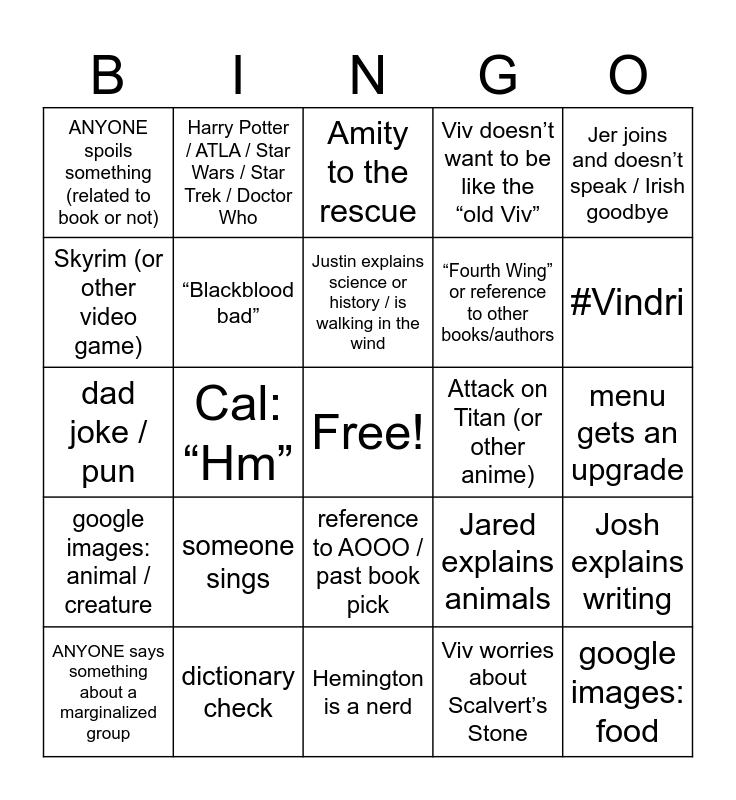 This bingo card has a free space and 24 words: someone sings, dictionary check, Justin explains science or history / is walking in the wind, ANYONE says something about a marginalized group, Jer joins and doesn’t speak / Irish goodbye, ANYONE spoils something (related to book or not), Skyrim (or other video game), Harry Potter / ATLA / Star Wars / Star Trek / Doctor Who, Attack on Titan (or other anime), reference to AOOO / past book pick, “Fourth Wing” or reference to other books/authors, dad joke / pun, Jared explains animals, Josh explains writing, “Blackblood bad”, Viv worries about Scalvert’s Stone, menu gets an upgrade, Amity to the rescue, #Vindri, Cal: “Hm”, google images: food, google images: animal / creature, Viv doesn’t want to be like the “old Viv” and Hemington is a nerd.