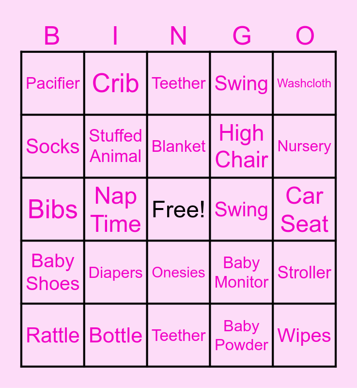 This bingo card has a free space and 24 words: Diapers, Bottle, Blanket, Rattle, Washcloth, Pacifier, Socks, Crib, Swing, Onesies, High Chair, Bibs, Baby Monitor, Stroller, Stuffed Animal, Baby Powder, Car Seat, Teether, Nursery, Nap Time, Wipes, Baby Shoes, Swing and Teether.