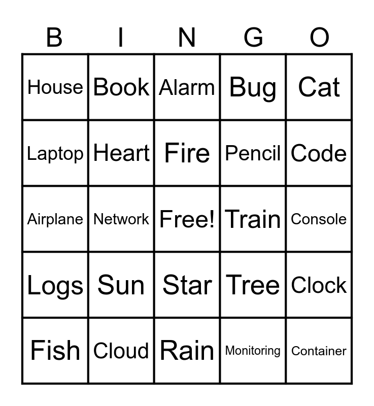 This bingo card has a free space and 25 words: Sun, Rain, Fire, Fish, Cat, House, Laptop, Book, Train, Star, Pencil, Airplane, Tree, Clock, Heart, Server, Console, Alarm, Code, Network, Container, Cloud, Logs, Bug and Monitoring.