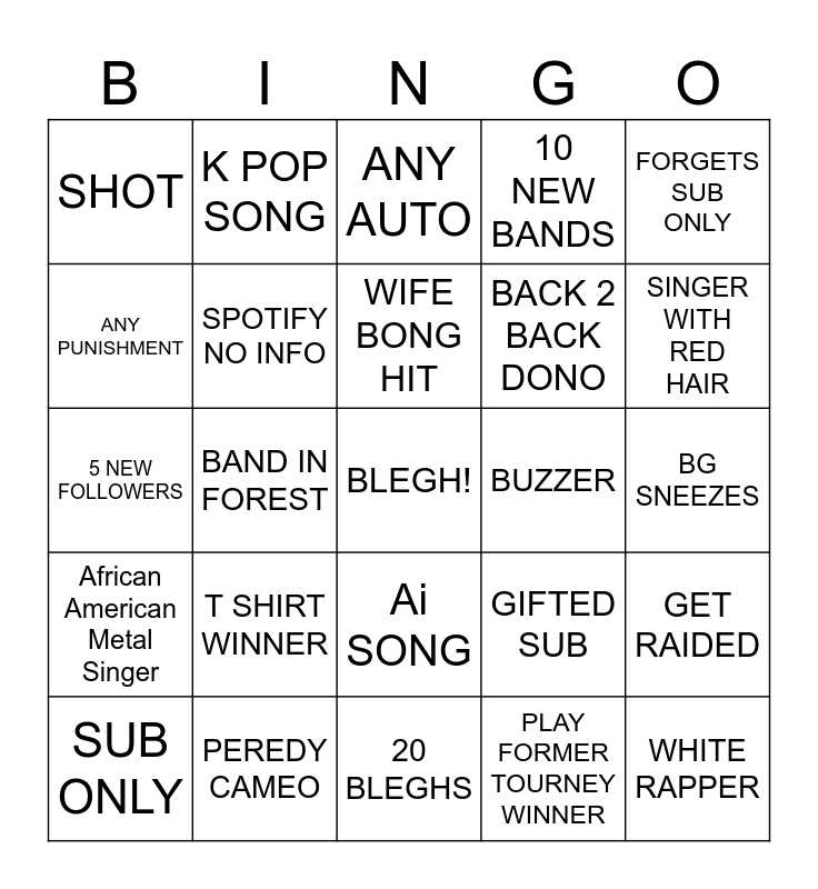 This bingo card has a free space and 24 words: T SHIRT WINNER, PEREDY CAMEO, WIFE BONG HIT, SUB ONLY, FORGETS SUB ONLY, SHOT, ANY PUNISHMENT, K POP SONG, BUZZER, Ai SONG, BACK 2 BACK DONO, 5 NEW FOLLOWERS, GIFTED SUB, GET RAIDED, SPOTIFY NO INFO, PLAY FORMER TOURNEY WINNER, BG SNEEZES, ANY AUTO, SINGER WITH RED HAIR, BAND IN FOREST, WHITE RAPPER, African American Metal Singer, 10 NEW BANDS and 20 BLEGHS.