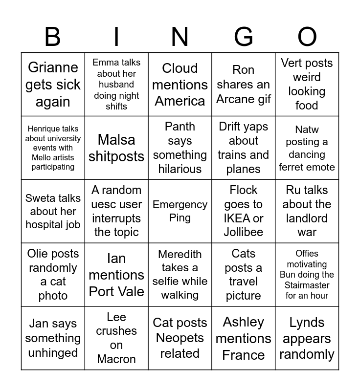 This bingo card has a free space and 24 words: Ian mentions Port Vale, Lee crushes on Macron, Panth says something hilarious, Jan says something unhinged, Vert posts weird looking food, Grianne gets sick again, Henrique talks about university events with Mello artists participating, Emma talks about her husband doing night shifts, Flock goes to IKEA or Jollibee, Meredith takes a selfie while walking, Drift yaps about trains and planes, Sweta talks about her hospital job, Cats posts a travel picture, Offies motivating Bun doing the Stairmaster for an hour, Malsa shitposts, Ashley mentions France, Ru talks about the landlord war, Cloud mentions America, Natw posting a dancing ferret emote, A random uesc user interrupts the topic, Lynds appears randomly, Olie posts randomly a cat photo, Ron shares an Arcane gif and Cat posts Neopets related.