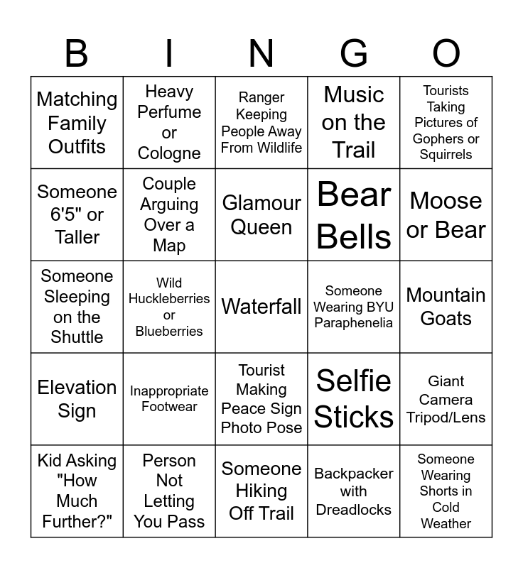 This bingo card has a free space and 24 words: Inappropriate Footwear, Person Not Letting You Pass, Glamour Queen, Kid Asking "How Much Further?", Tourists Taking Pictures of Gophers or Squirrels, Matching Family Outfits, Someone 6'5" or Taller, Heavy Perfume or Cologne, Someone Wearing BYU Paraphenelia, Tourist Making Peace Sign Photo Pose, Bear Bells, Someone Sleeping on the Shuttle, Selfie Sticks, Giant Camera Tripod/Lens, Couple Arguing Over a Map, Backpacker with Dreadlocks, Mountain Goats, Ranger Keeping People Away From Wildlife, Moose or Bear, Wild Huckleberries or Blueberries, Someone Wearing Shorts in Cold Weather, Elevation Sign, Music on the Trail and Someone Hiking Off Trail.