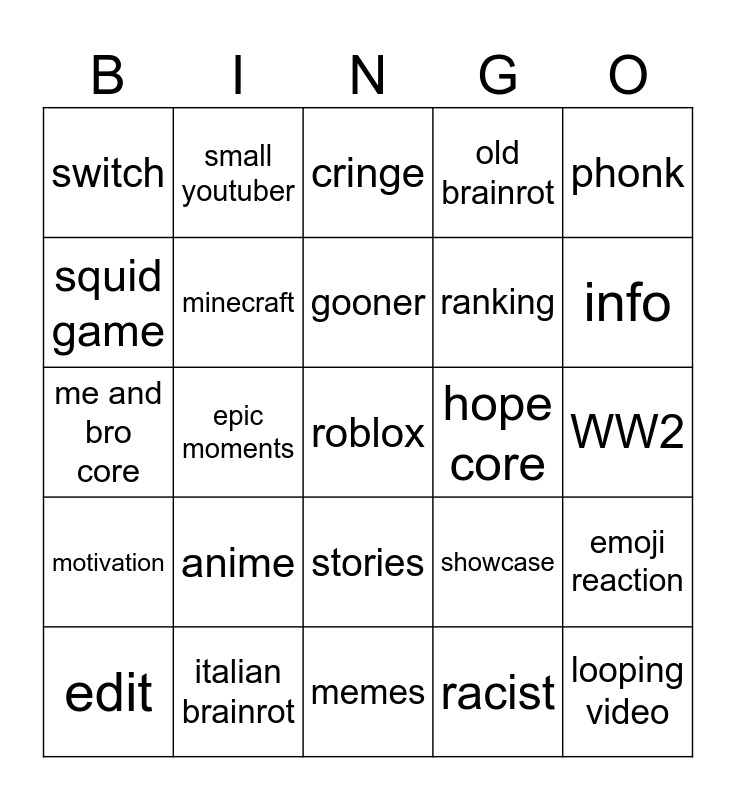 This bingo card has a free space and 24 words: anime, italian brainrot, gooner, edit, phonk, switch, squid game, small youtuber, hope core, stories, ranking, me and bro core, showcase, emoji reaction, minecraft, racist, WW2, cringe, info, epic moments, looping video, motivation, old brainrot and memes.