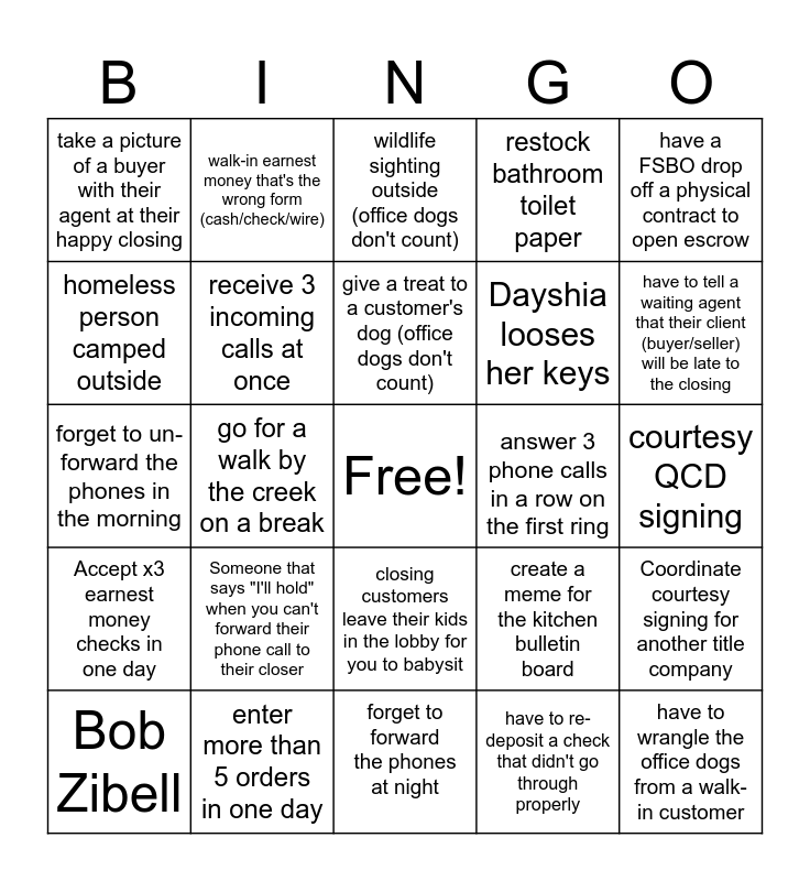This bingo card has a free space and 24 words: Someone that says "I'll hold" when you can't forward their phone call to their closer, enter more than 5 orders in one day, give a treat to a customer's dog (office dogs don't count), Bob Zibell, have a FSBO drop off a physical contract to open escrow, take a picture of a buyer with their agent at their happy closing, homeless person camped outside, walk-in earnest money that's the wrong form (cash/check/wire), answer 3 phone calls in a row on the first ring, closing customers leave their kids in the lobby for you to babysit, Dayshia looses her keys, forget to un-forward the phones in the morning, create a meme for the kitchen bulletin board, Coordinate courtesy signing for another title company, receive 3 incoming calls at once, have to re-deposit a check that didn't go through properly, courtesy QCD signing, wildlife sighting outside (office dogs don't count), have to tell a waiting agent that their client (buyer/seller) will be late to the closing, go for a walk by the creek on a break, have to wrangle the office dogs from a walk-in customer, Accept x3 earnest money checks in one day, restock bathroom toilet paper and forget to forward the phones at night.