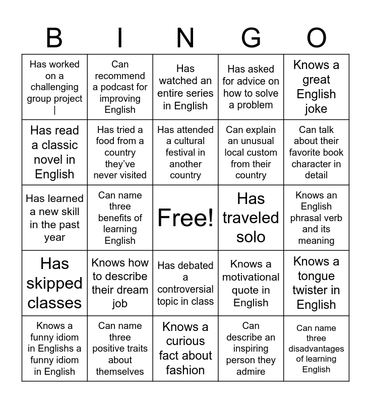 This bingo card has a free space and 24 words: Knows how to describe their dream job, Can name three positive traits about themselves, Has attended a cultural festival in another country, Knows a funny idiom in Englishs a funny idiom in English, Knows a great English joke, Has worked on a challenging group project |, Has read a classic novel in English, Can recommend a podcast for improving English, Has traveled solo, Has debated a controversial topic in class, Can explain an unusual local custom from their country, Has learned a new skill in the past year, Knows a motivational quote in English, Knows a tongue twister in English, Has tried a food from a country they’ve never visited, Can describe an inspiring person they admire, Knows an English phrasal verb and its meaning, Has watched an entire series in English, Can talk about their favorite book character in detail, Can name three benefits of learning English, Can name three disadvantages of learning English, Has skipped classes, Has asked for advice on how to solve a problem and Knows a curious fact about fashion.