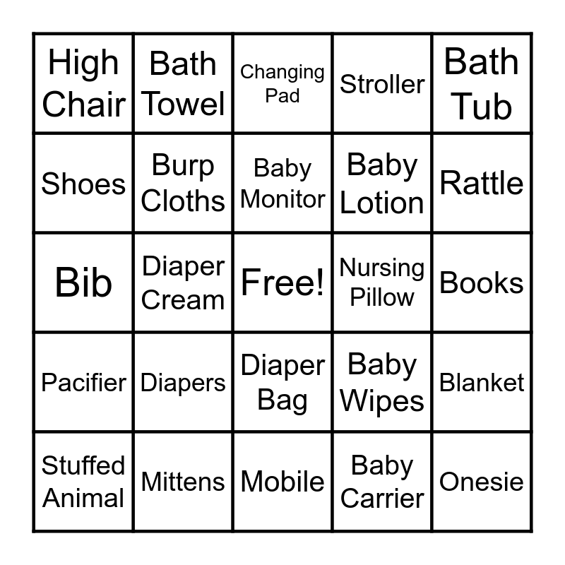 This bingo card has a free space and 24 words: Diapers, Mittens, Baby Monitor, Stuffed Animal, Bath Tub, High Chair, Shoes, Bath Towel, Nursing Pillow, Diaper Bag, Baby Lotion, Bib, Baby Wipes, Blanket, Burp Cloths, Baby Carrier, Books, Changing Pad, Rattle, Diaper Cream, Onesie, Pacifier, Stroller and Mobile.