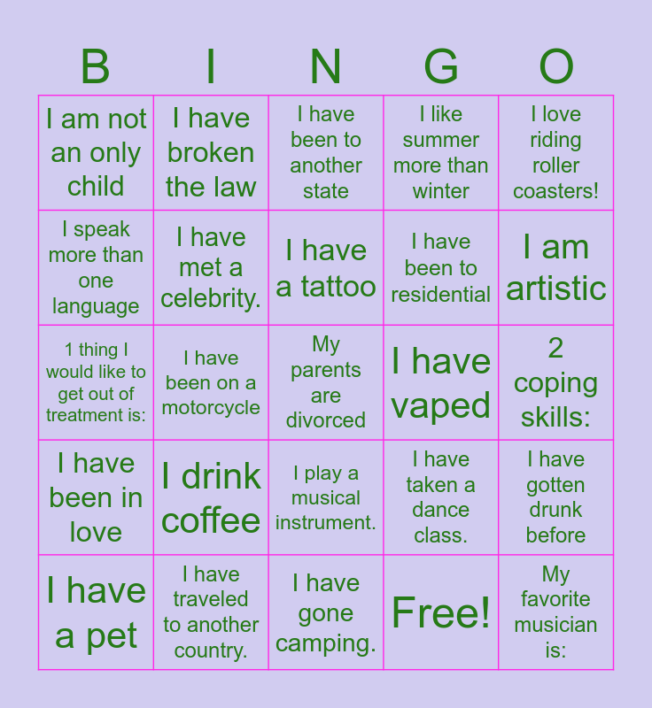 This bingo card has 30 words: I have traveled to another country., 3 things I am grateful for:, I have been on a motorcycle, I have ridden a horse., I am not an only child, I have been to another state, I have met a celebrity., I play a musical instrument., I have vaped, I have gone camping., 2 coping skills:, My parents are divorced, Free!, My favorite musician is:, I am artistic, 2 triggers of mine:, I have taken a dance class., I have been in love, I drink coffee, I love riding roller coasters!, 1 thing I would like to get out of treatment is:, I have a summer birthday, I have broken the law, I have been to residential, I speak more than one language, I like summer more than winter, I have gotten drunk before, I have a pet, I have a tattoo and 1 thing I like about myself:.