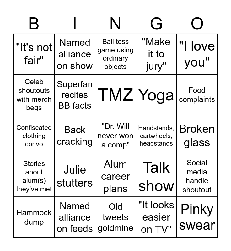 This bingo card has a free space and 24 words: Julie stutters, Named alliance on feeds, TMZ, Hammock dump, "I love you", "It's not fair", Celeb shoutouts with merch begs, Named alliance on show, Handstands, cartwheels, headstands, Alum career plans, Yoga, Confiscated clothing convo, Talk show, Social media handle shoutout, Superfan recites BB facts, "It looks easier on TV", Broken glass, Ball toss game using ordinary objects, Food complaints, Back cracking, Pinky swear, Stories about alum(s) they've met, "Make it to jury" and Old tweets goldmine.
