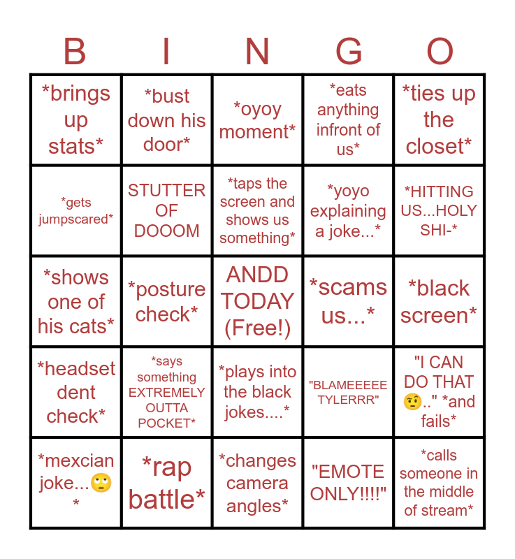 This bingo card has a free space and 35 words: *reads one nose joke*, *one 9/11 joke*, "aye man say man", STUTTER OF DOOOM, *plays into the black jokes....*, *eats anything infront of us*, *gets jumpscared*, *leaves the room*, *taps the screen and shows us something*, *Spray bottle*, *shows one of his cats*, *ties up the closet*, "hear me out tho....", *a gay "joke" somewhere*, *brings up stats*, *scams us...*, "EMOTE ONLY!!!!", *posture check*, *headset dent check*, *calls someone in the middle of stream*, "BLAMEEEEE TYLERRR", *mexcian joke...🙄*, "I CAN DO THAT🤨.." *and fails*, *rap battle*, *oyoy moment*, *HITTING US...HOLY SHI-*, *targets one of his mods...*, *drink out of something other than a water bottle/cup*, *yoyo explaining a joke...*, *black screen*, *points at us* (hes projecting dw), *changes camera angles*, *says something EXTREMELY OUTTA POCKET*, *bust down his door* and *messes up a chatters name*.