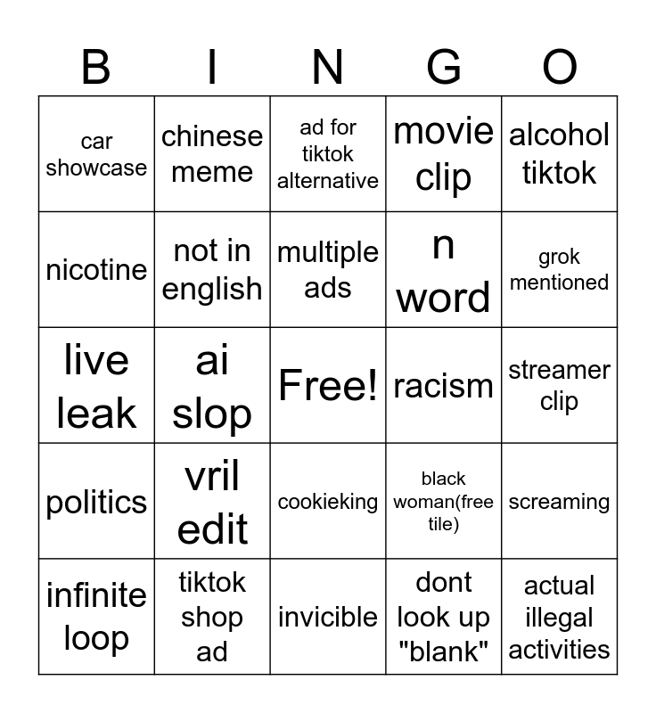 This bingo card has a free space and 25 words: vril edit, invicible, multiple ads, infinite loop, alcohol tiktok, car showcase, nicotine, chinese meme, racism, cookieking, n word, live leak, black woman(free tile), screaming, not in english, betting ad, streamer clip, ad for tiktok alternative, grok mentioned, ai slop, actual illegal activities, tiktok shop ad, politics, movie clip and dont look up "blank".