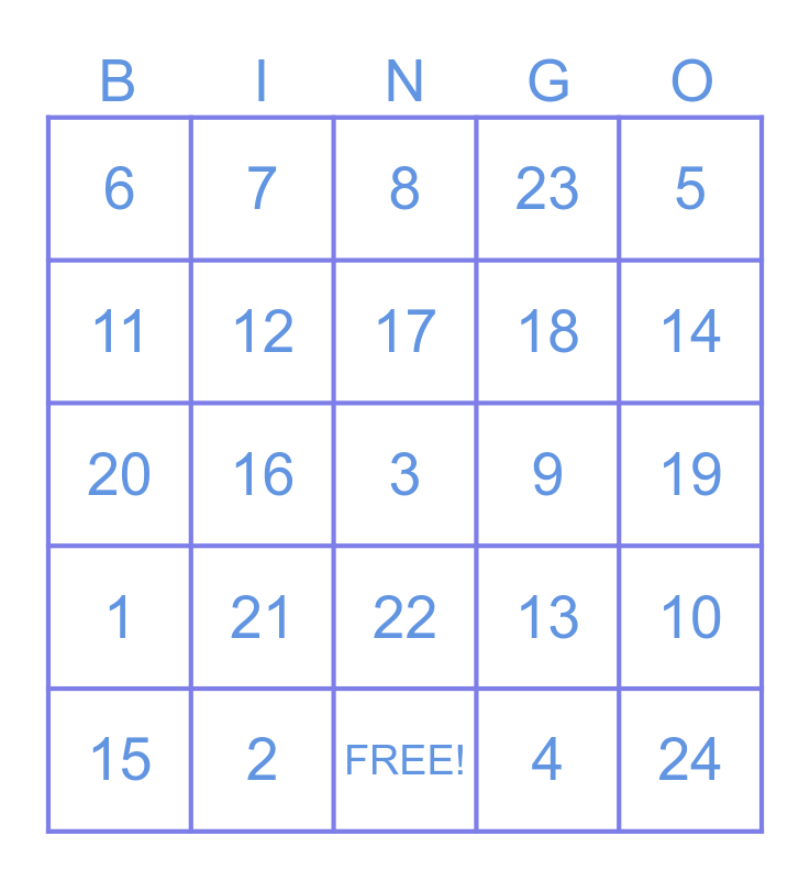 This bingo card has 25 words: 1, 2, 3, 4, 5, 6, 7, 8, 9, 10, 11, 12, FREE!, 13, 14, 15, 16, 17, 18, 19, 20, 21, 22, 23 and 24.