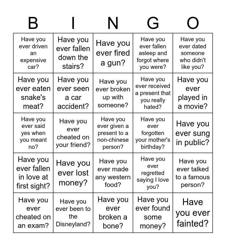This bingo card has 25 words: Have you ever lost money?, Have you ever broken a bone?, Have you ever broken up with someone?, Have you ever cheated on an exam?, Have you ever dated someone who didn't like you?, Have you ever driven an expensive car?, Have you ever eaten snake's meat?, Have you ever fallen down the stairs?, Have you ever forgotten your mother's birthday?, Have you ever made any western food?, Have you ever received a present that you really hated?, Have you ever said yes when you meant no?, Have you ever regretted saying I love you?, Have you ever talked to a famous person?, Have you ever seen a car accident?, Have you ever fainted?, Have you ever sung in public?, Have you ever fired a gun?, Have you ever played in a movie?, Have you ever cheated on your friend?, Have you ever given a present to a non-chinese person?, Have you ever been to the Disneyland?, Have you ever fallen in love at first sight?, Have you ever fallen asleep and forgot where you were? and Have you ever found some money?.