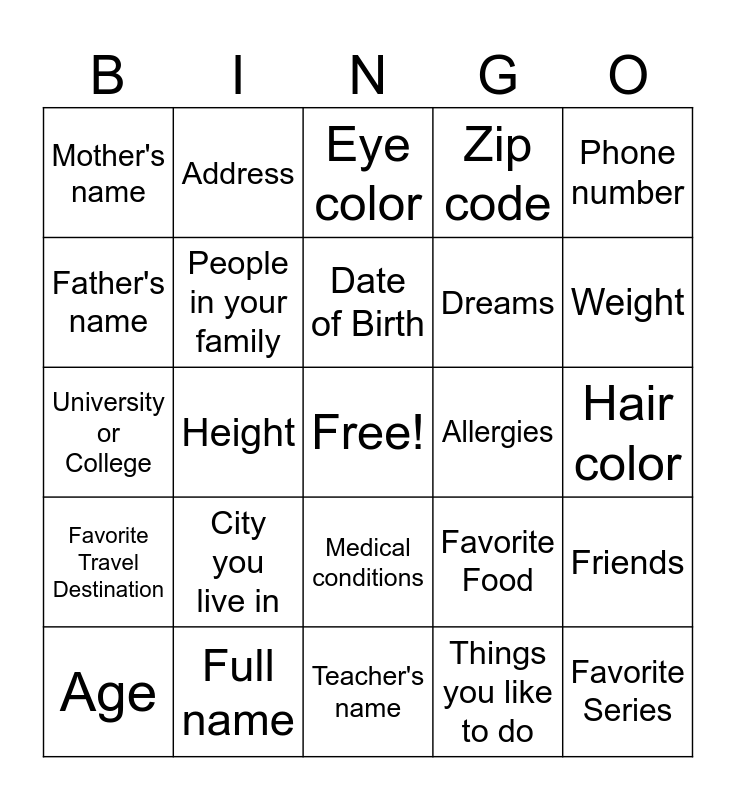 This bingo card has a free space and 24 words: City you live in, Full name, Date of Birth, Age, Phone number, Mother's name, Father's name, Address, Allergies, Medical conditions, Dreams, University or College, Favorite Food, Friends, People in your family, Things you like to do, Hair color, Eye color, Weight, Height, Favorite Series, Favorite Travel Destination, Zip code and Teacher's name.